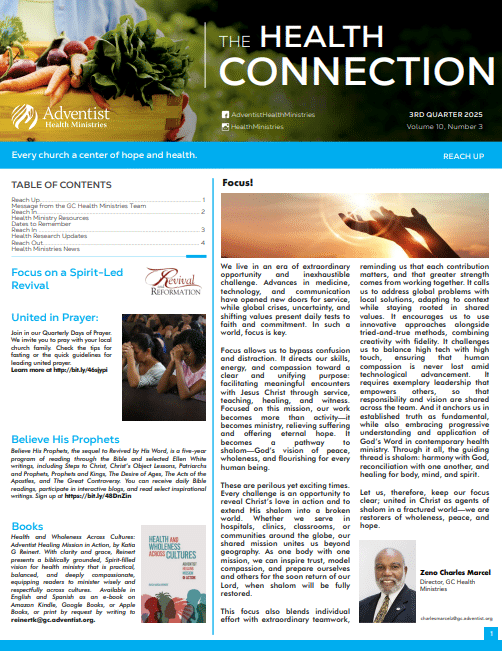 This free quarterly newsletter will keep you current on valuable health topics and health ministry developments around the globe. Enjoy news, articles, health ministry ideas, event invitations, and more. You can subscribe via email and download past newsletters on this page. We hope The Health Connection is a blessing for you to read and share!